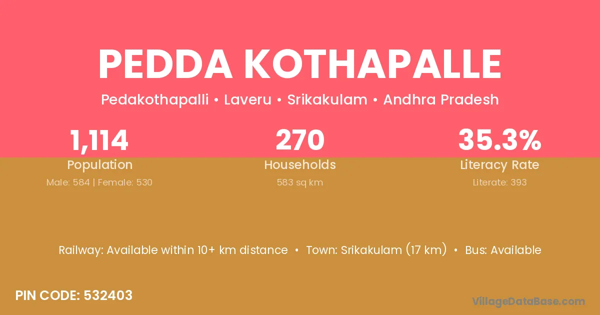 Pedda Kothapalle village has a total population of 1,114 people, of which 584 are males and 530 are females.