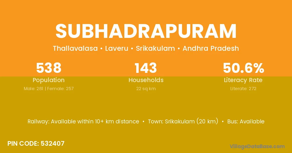 Subhadrapuram village has a total population of 538 people, of which 281 are males and 257 are females.