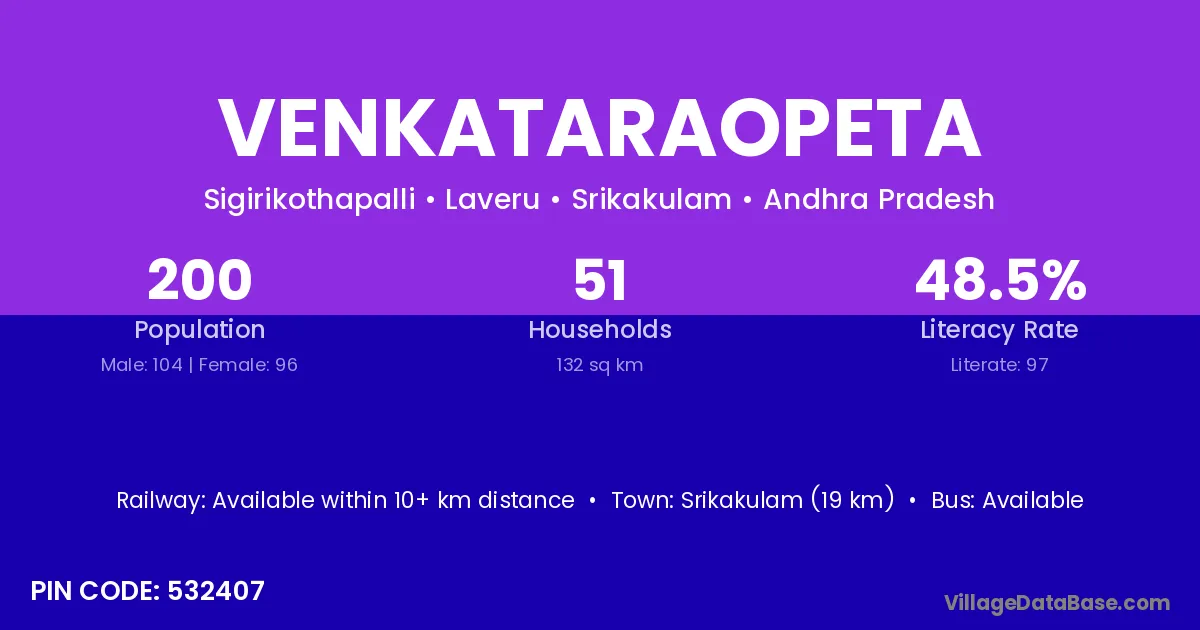 Venkataraopeta village has a total population of 200 people, of which 104 are males and 96 are females.