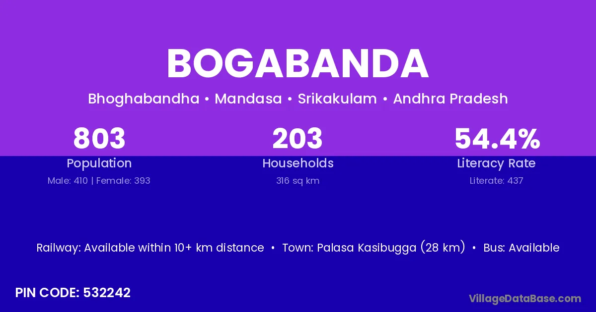 Palasa Kasibugga (28 km) is the nearest town to Bogabanda village for major economic activities and is located approximately 28 km away.