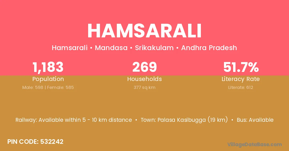 Palasa Kasibugga (19 km) is the nearest town to Hamsarali village for major economic activities and is located approximately 19 km away.