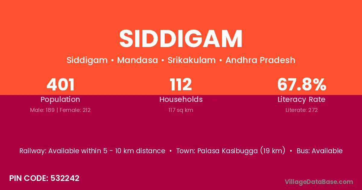 Palasa Kasibugga (19 km) is the nearest town to Siddigam village for major economic activities and is located approximately 19 km away.