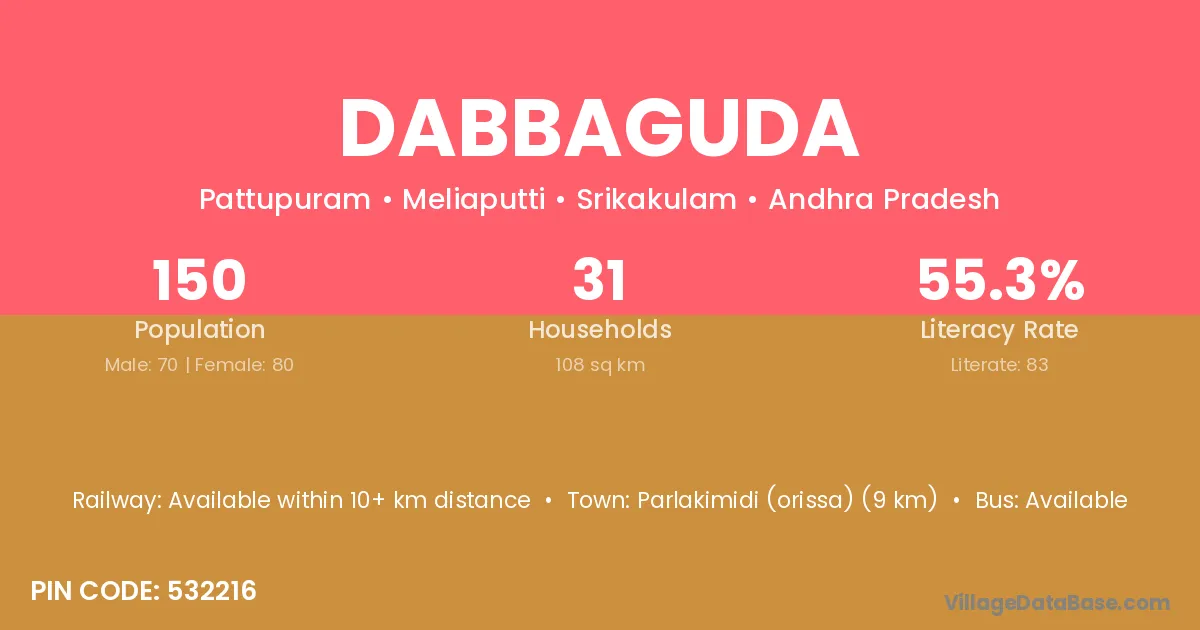 Parlakimidi (orissa) (9 km) is the nearest town to Dabbaguda village for major economic activities and is located approximately 9 km away.