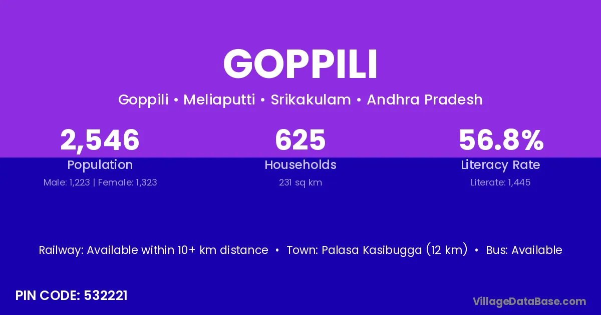 Palasa Kasibugga (12 km) is the nearest town to Goppili village for major economic activities and is located approximately 12 km away.