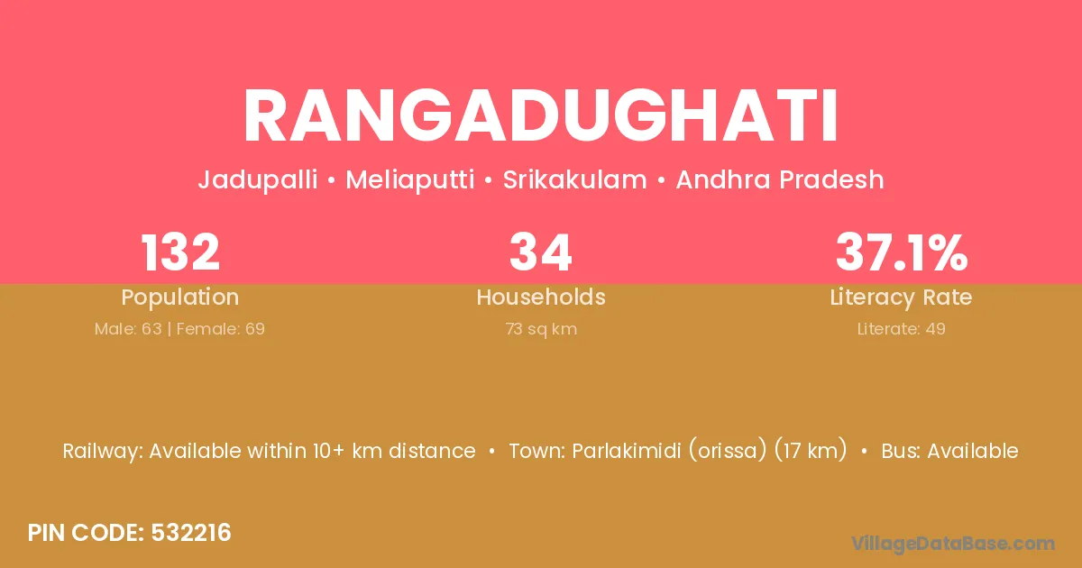 Parlakimidi (orissa) (17 km) is the nearest town to Rangadughati village for major economic activities and is located approximately 17 km away.