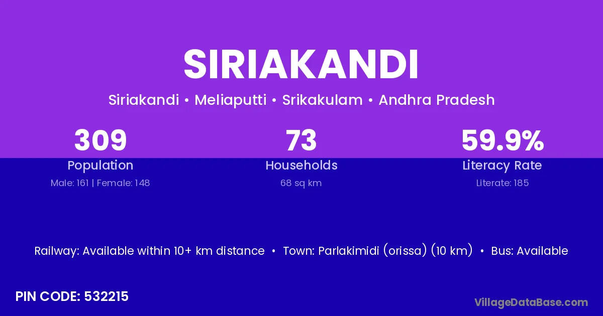 Parlakimidi (orissa) (10 km) is the nearest town to Siriakandi village for major economic activities and is located approximately 10 km away.