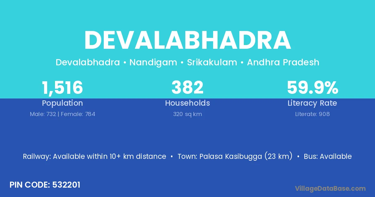 Devalabhadra village has a total population of 1,516 people, of which 732 are males and 784 are females.