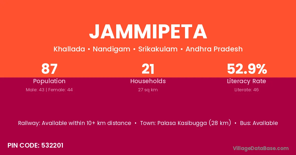Jammipeta village has a total population of 87 people, of which 43 are males and 44 are females.