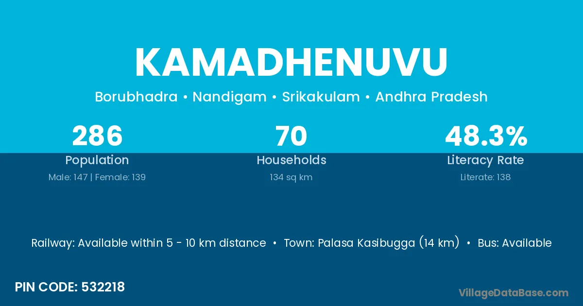 Palasa Kasibugga (14 km) is the nearest town to Kamadhenuvu village for major economic activities and is located approximately 14 km away.