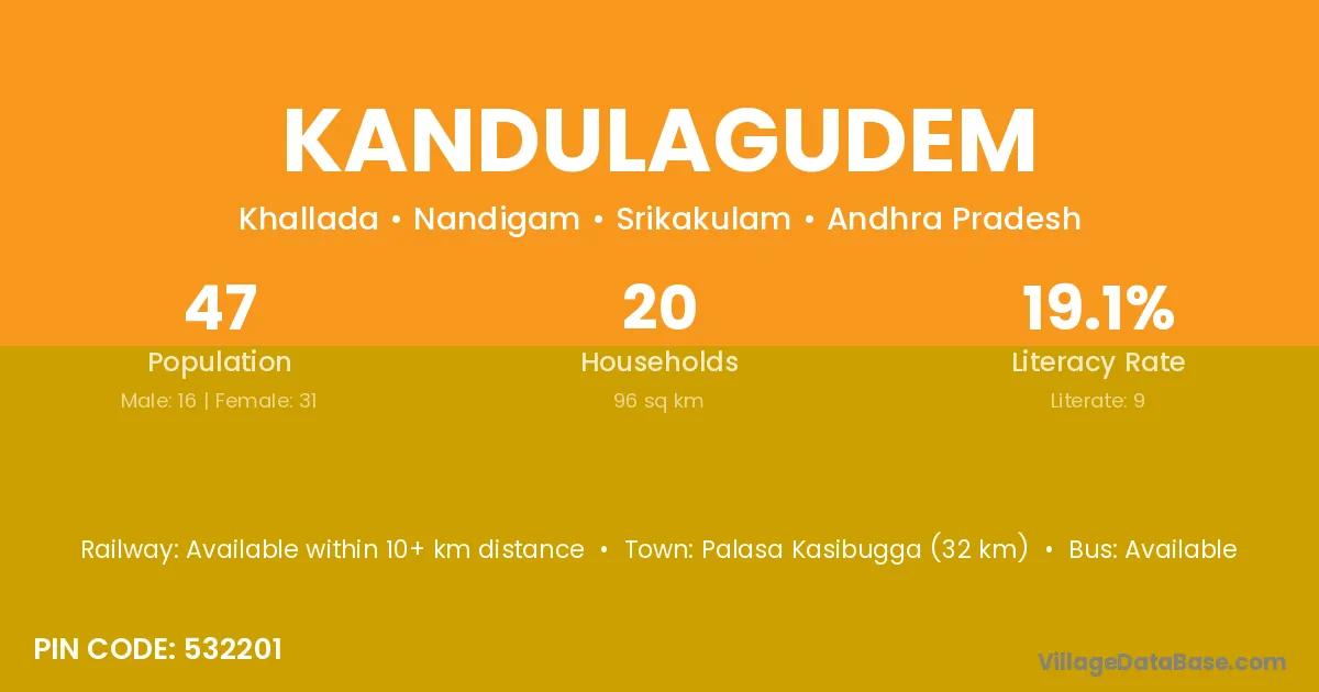 Kandulagudem village has a total population of 47 people, of which 16 are males and 31 are females.