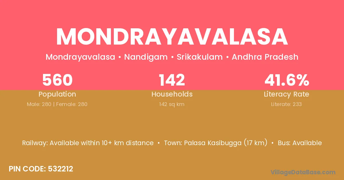Mondrayavalasa village has a total population of 560 people, of which 280 are males and 280 are females.