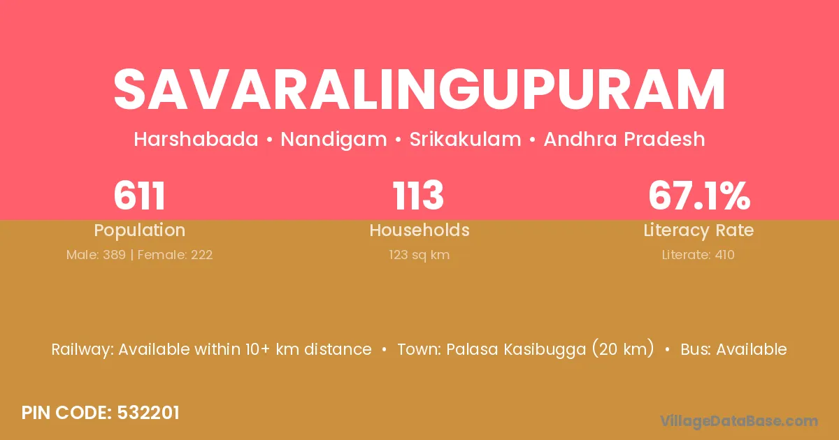 Savaralingupuram village has a total population of 611 people, of which 389 are males and 222 are females.