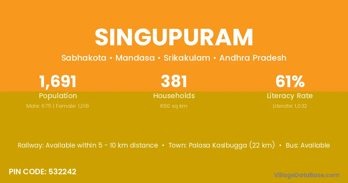 Palasa Kasibugga (22 km) is the nearest town to Singupuram village for major economic activities and is located approximately 22 km away.