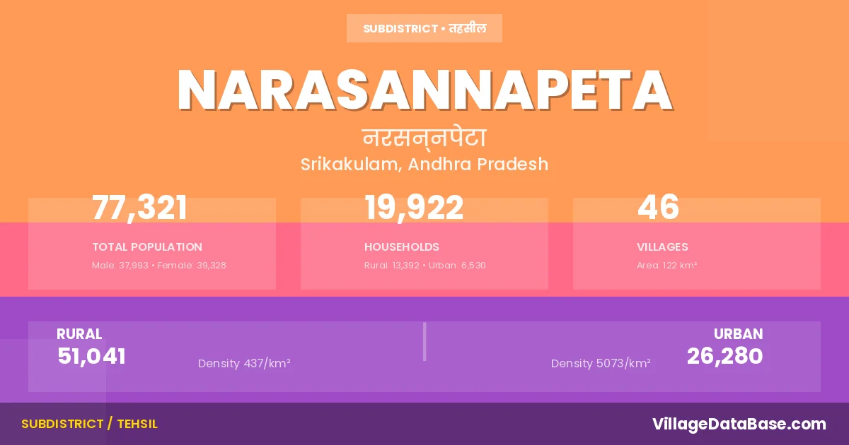 According to the 2011 census The total area of Narasannapeta Mandal is 122 km², with a population of 77321 people. The population density is 634 inhabitants per square kilometre, and there are approximately 19922 houses in the sub district.