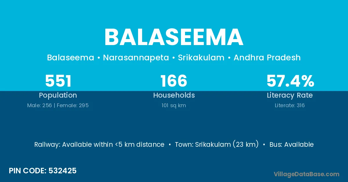 Srikakulam (23 km) is the nearest town to Balaseema village for major economic activities and is located approximately 23 km away.