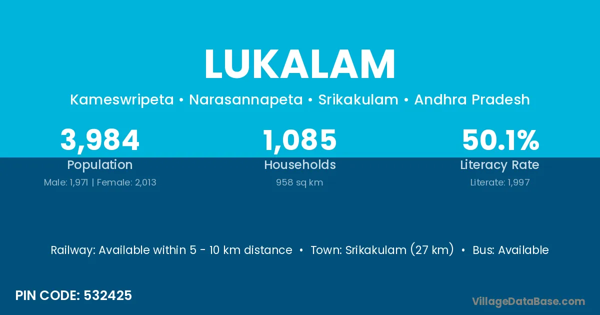 Srikakulam (27 km) is the nearest town to Lukalam village for major economic activities and is located approximately 27 km away.