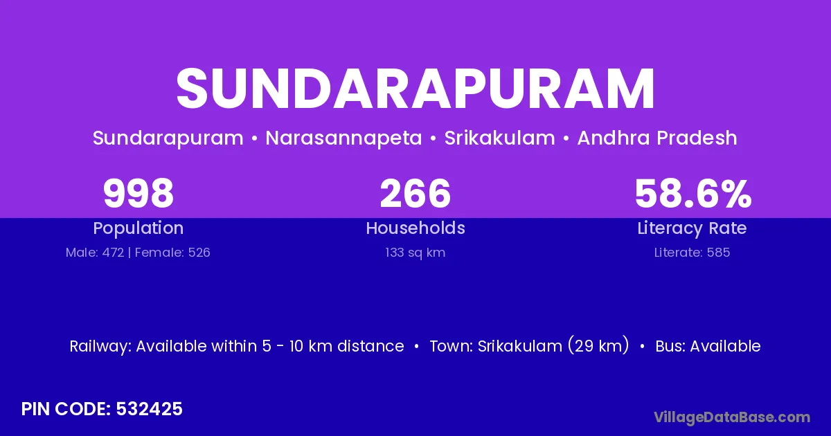 Sundarapuram village has a total population of 998 people, of which 472 are males and 526 are females.