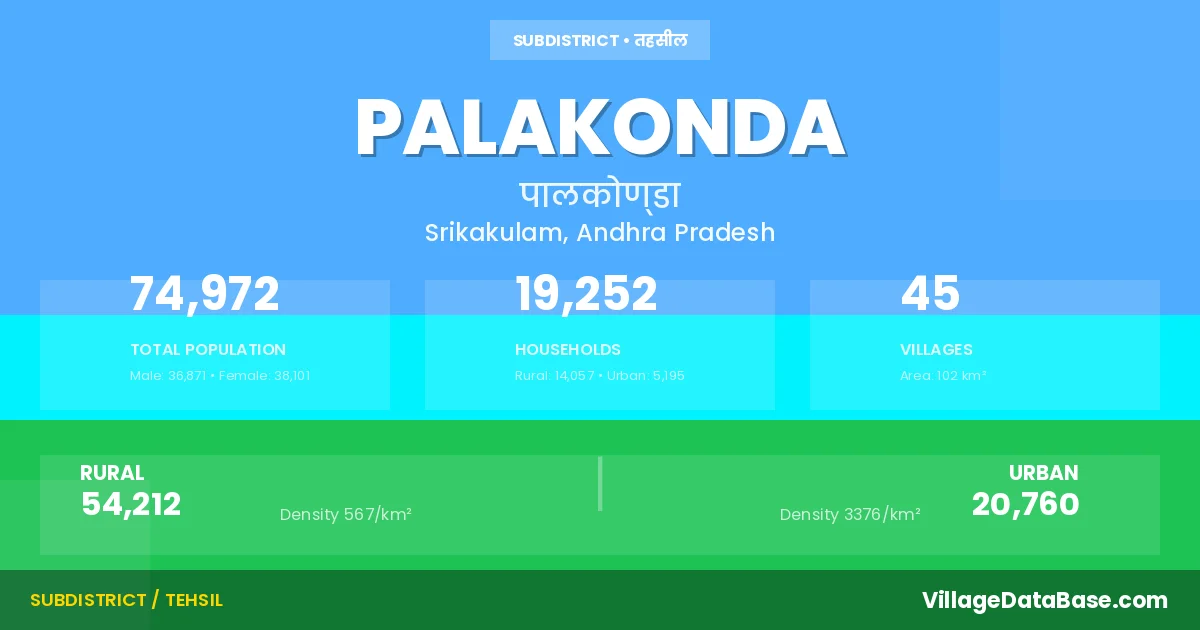 According to the 2011 census The total area of Palakonda Mandal is 102 km², with a population of 74972 people. The population density is 736 inhabitants per square kilometre, and there are approximately 19252 houses in the sub district.