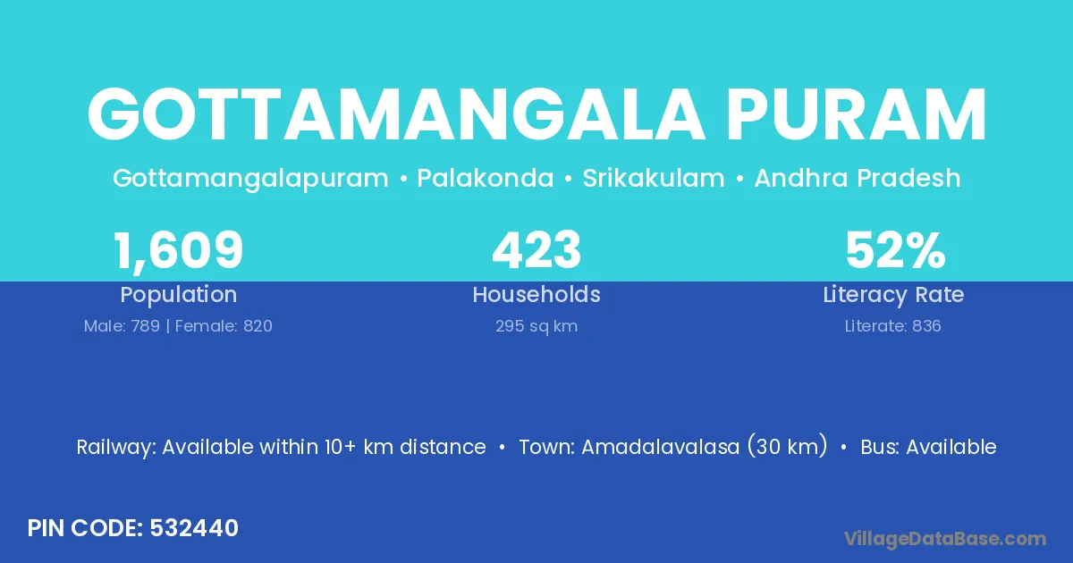 Amadalavalasa (30 km) is the nearest town to Gottamangala Puram village for major economic activities and is located approximately 30 km away.