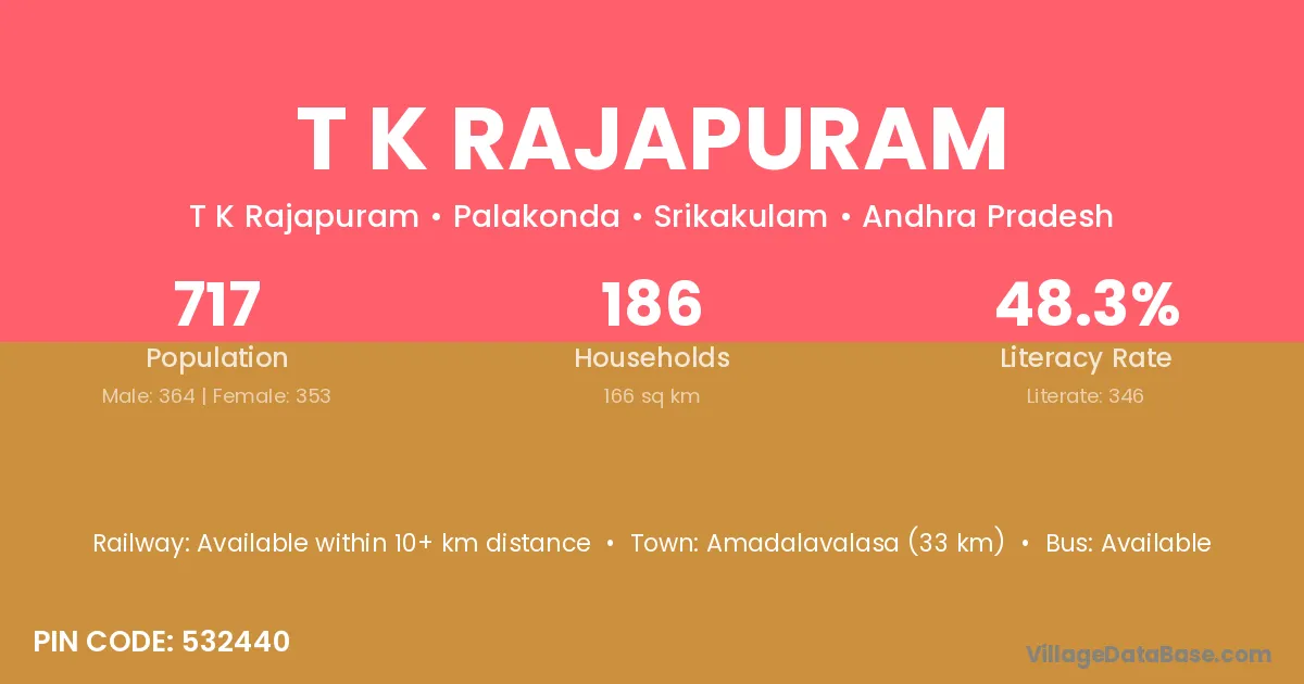Amadalavalasa (33 km) is the nearest town to T K Rajapuram village for major economic activities and is located approximately 33 km away.