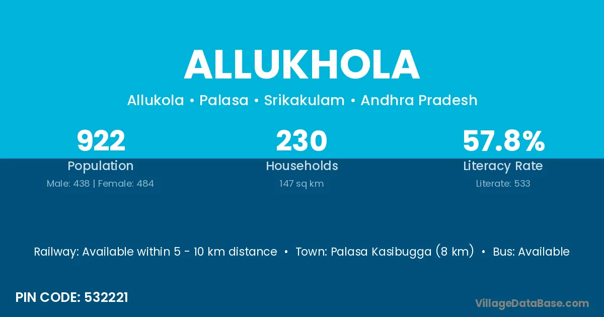 Palasa Kasibugga (8 km) is the nearest town to Allukhola village for major economic activities and is located approximately 8 km away.