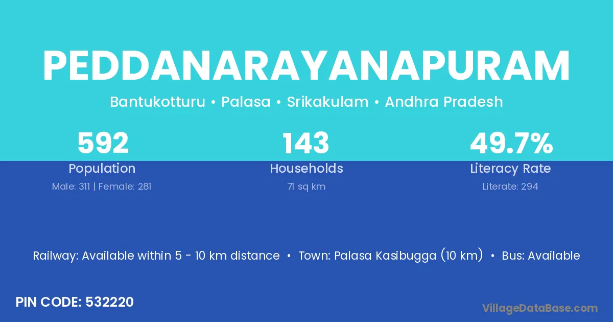 Palasa Kasibugga (10 km) is the nearest town to Peddanarayanapuram village for major economic activities and is located approximately 10 km away.