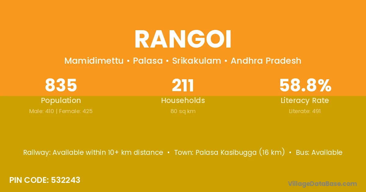 Palasa Kasibugga (16 km) is the nearest town to Rangoi village for major economic activities and is located approximately 16 km away.