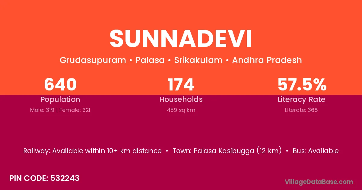 Palasa Kasibugga (12 km) is the nearest town to Sunnadevi village for major economic activities and is located approximately 12 km away.