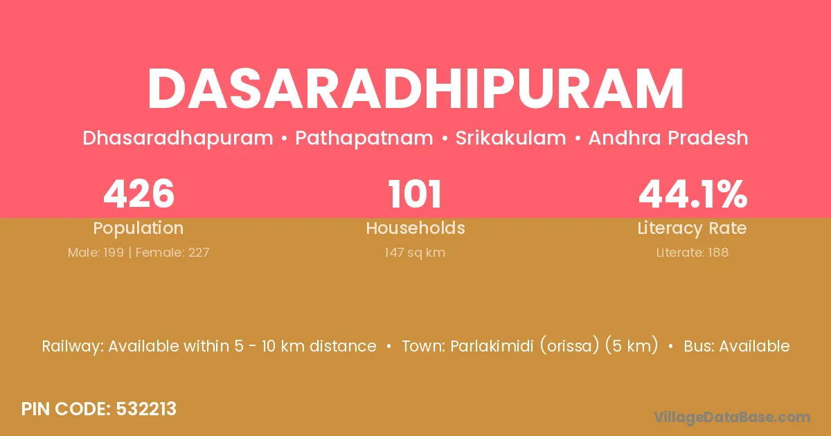 Parlakimidi (orissa) (5 km) is the nearest town to Dasaradhipuram village for major economic activities and is located approximately 5 km away.