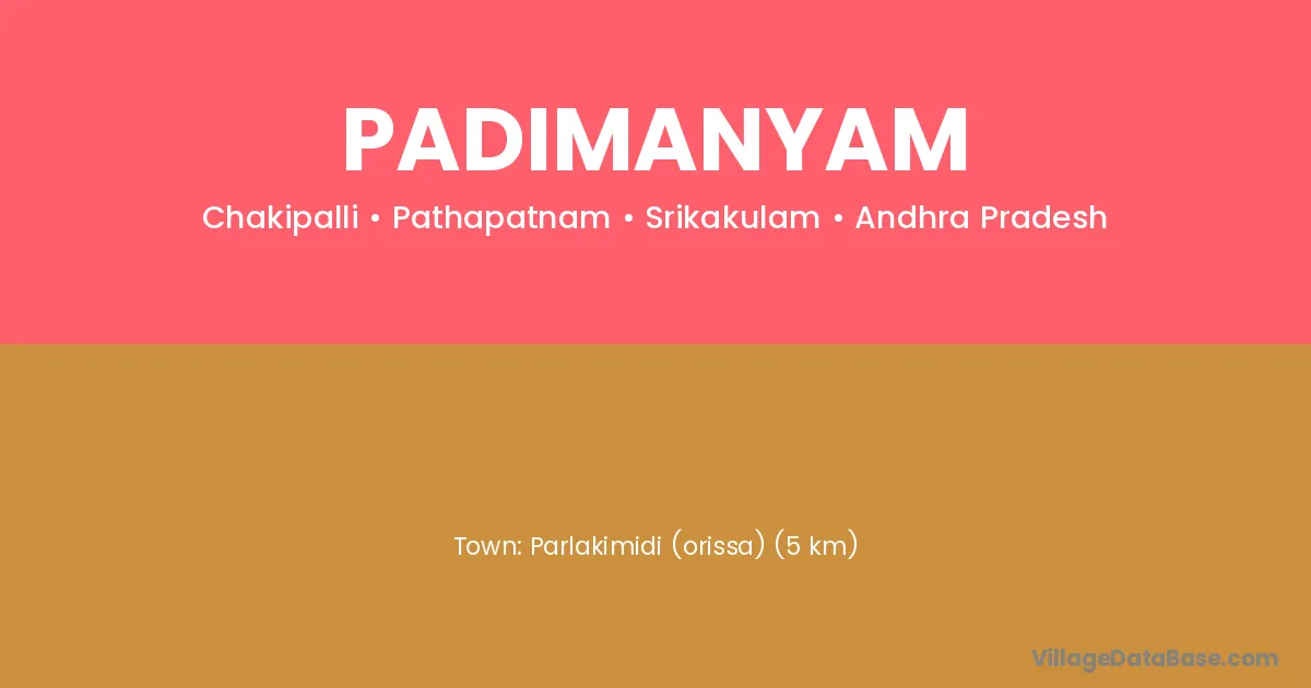 Parlakimidi (orissa) (5 km) is the nearest town to Padimanyam village for major economic activities and is located approximately 5 km away.