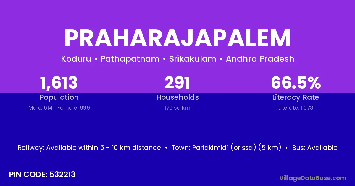 Parlakimidi (orissa) (5 km) is the nearest town to Praharajapalem village for major economic activities and is located approximately 5 km away.