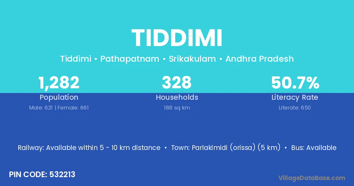 Parlakimidi (orissa) (5 km) is the nearest town to Tiddimi village for major economic activities and is located approximately 5 km away.