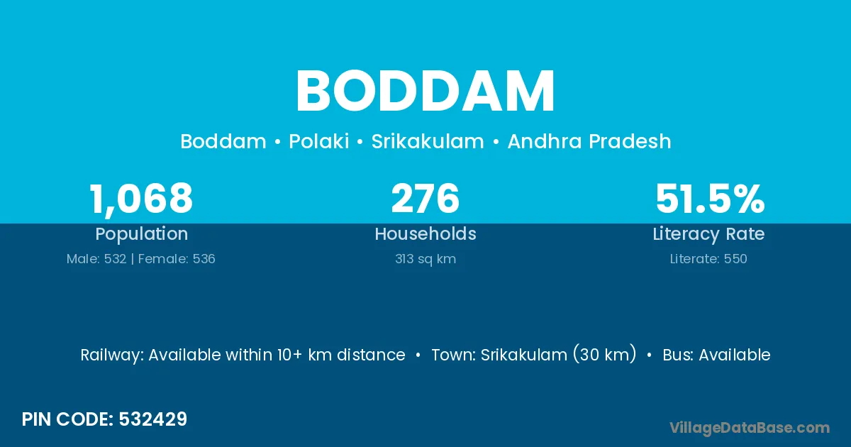 Srikakulam (30 km) is the nearest town to Boddam village for major economic activities and is located approximately 30 km away.