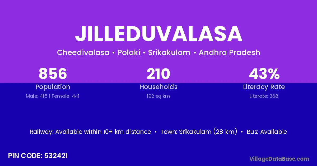 Jilleduvalasa village has a total population of 856 people, of which 415 are males and 441 are females.