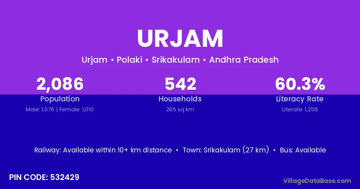 Srikakulam (27 km) is the nearest town to Urjam village for major economic activities and is located approximately 27 km away.