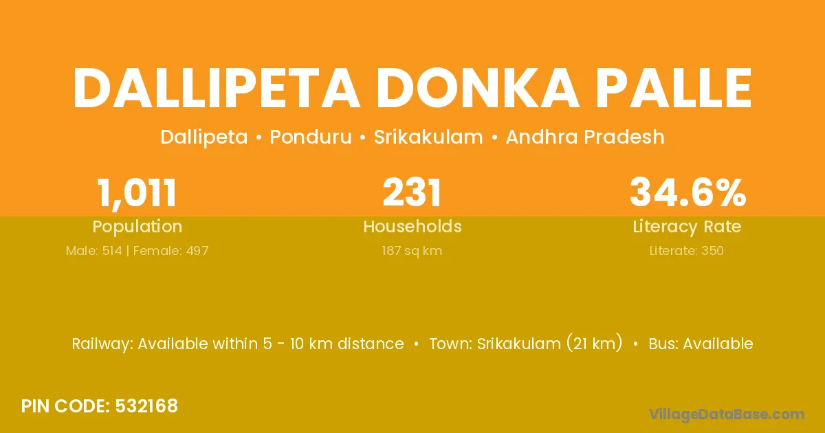 Dallipeta Donka Palle village has a total population of 1,011 people, of which 514 are males and 497 are females.