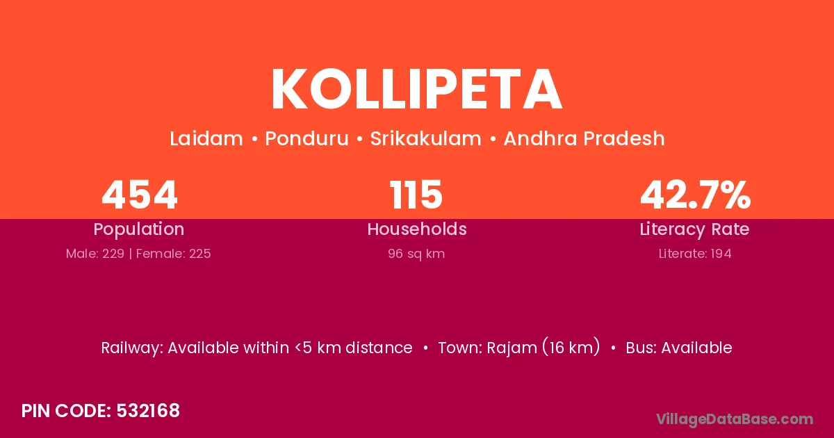 Rajam (16 km) is the nearest town to Kollipeta village for major economic activities and is located approximately 16 km away.