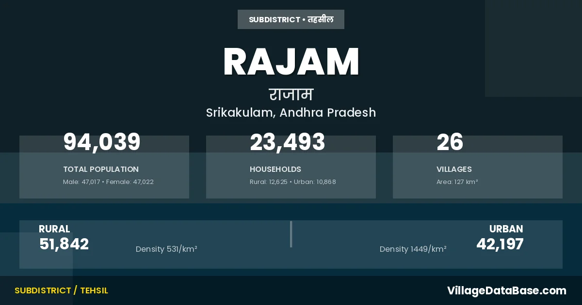 According to the 2011 census The total area of Rajam Mandal is 127 km², with a population of 94039 people. The population density is 742 inhabitants per square kilometre, and there are approximately 23493 houses in the sub district.