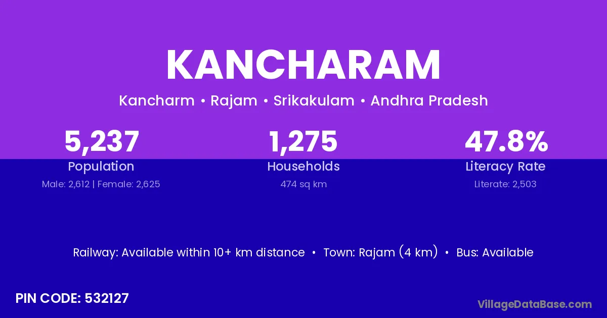 Rajam (4 km) is the nearest town to Kancharam village for major economic activities and is located approximately 4 km away.