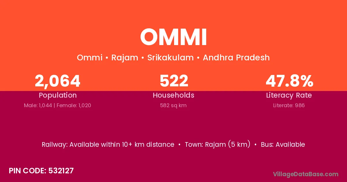 Rajam (5 km) is the nearest town to Ommi village for major economic activities and is located approximately 5 km away.