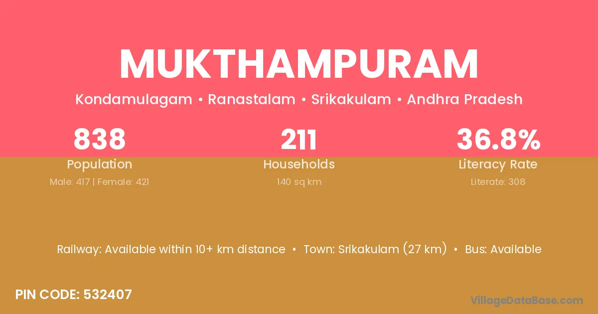 Mukthampuram village has a total population of 838 people, of which 417 are males and 421 are females.
