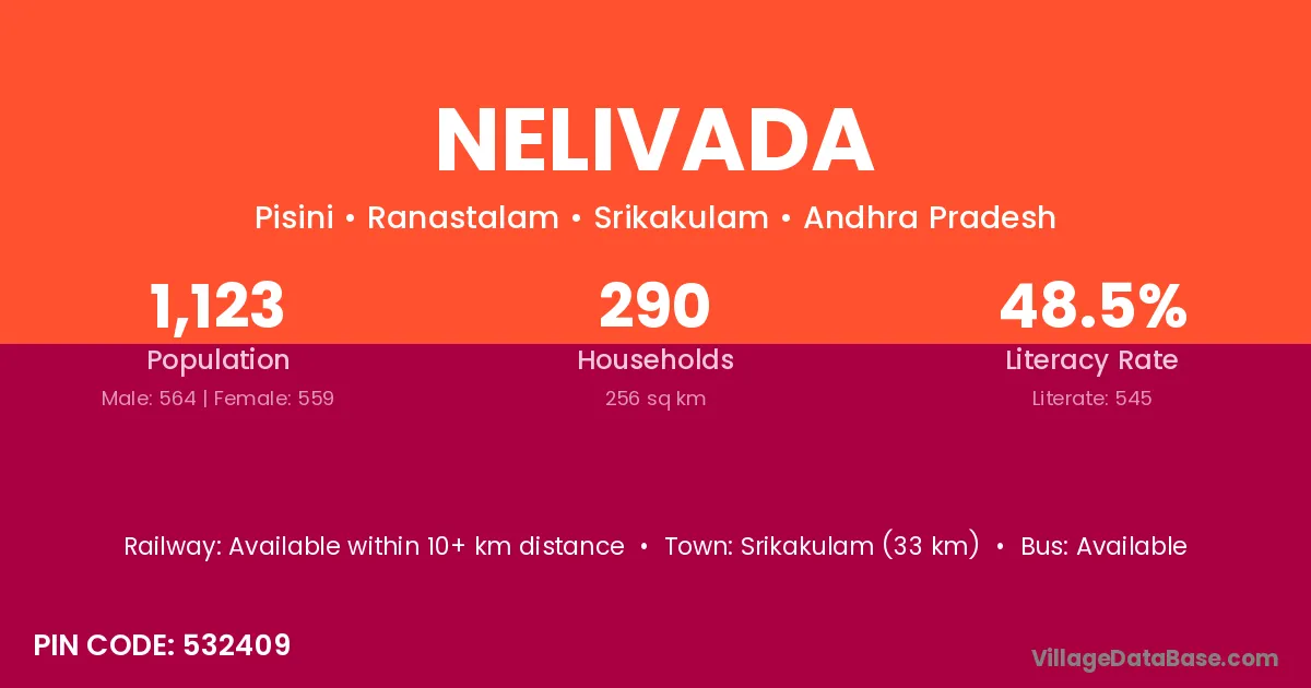 Srikakulam (33 km) is the nearest town to Nelivada village for major economic activities and is located approximately 33 km away.