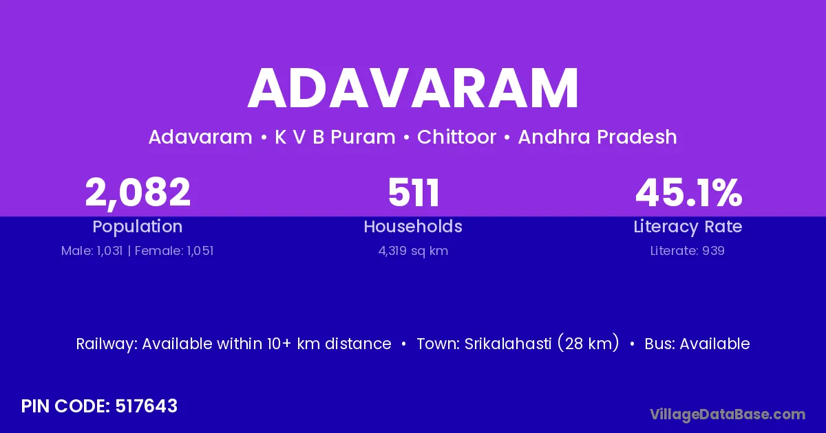 Rajam (14 km) is the nearest town to Adavaram village for major economic activities and is located approximately 14 km away.