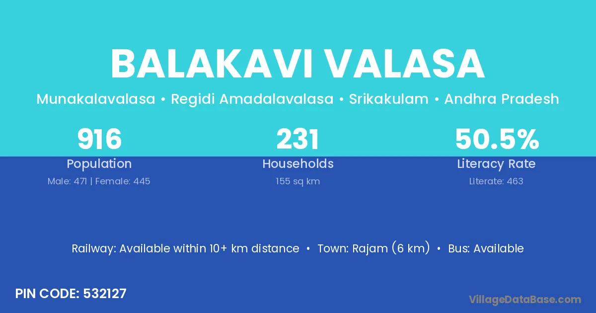 Balakavi Valasa village has a total population of 916 people, of which 471 are males and 445 are females.