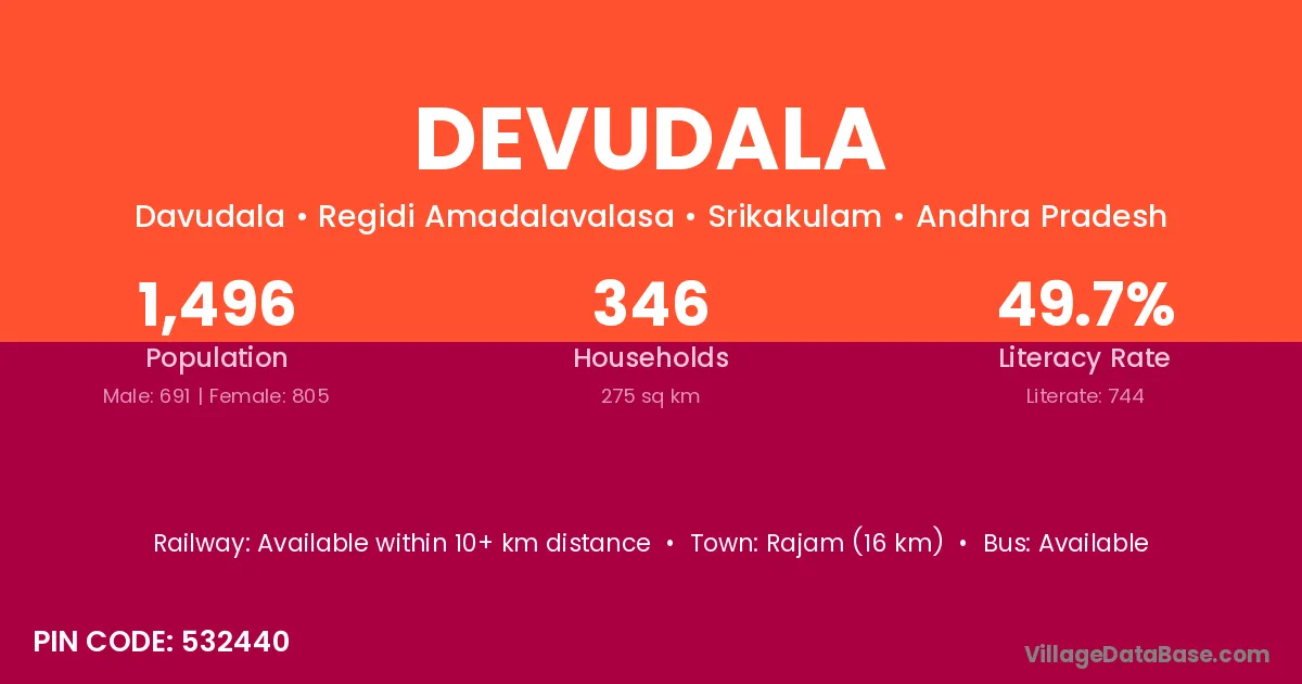 Rajam (16 km) is the nearest town to Devudala village for major economic activities and is located approximately 16 km away.
