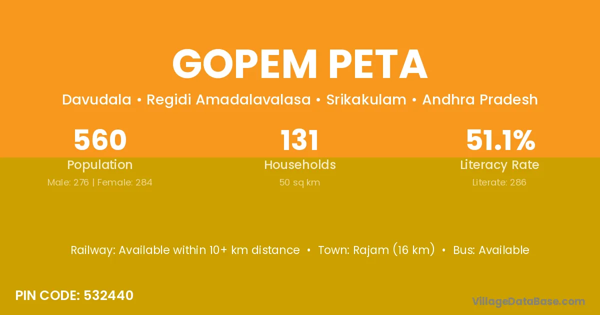 Rajam (16 km) is the nearest town to Gopem Peta village for major economic activities and is located approximately 16 km away.