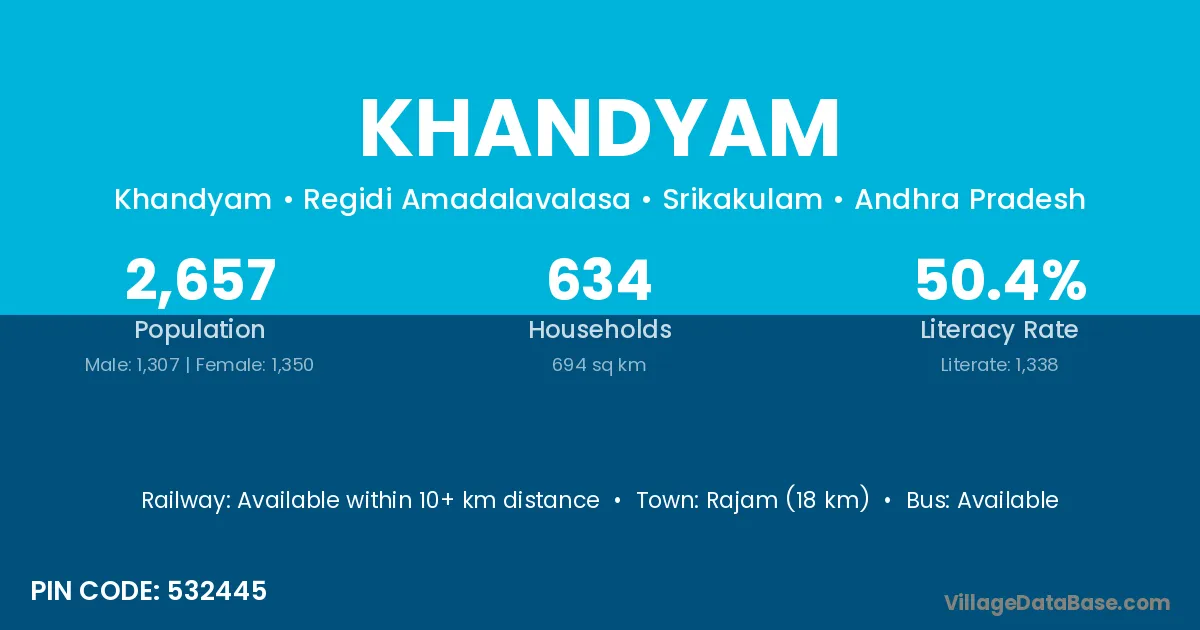 Rajam (18 km) is the nearest town to Khandyam village for major economic activities and is located approximately 18 km away.