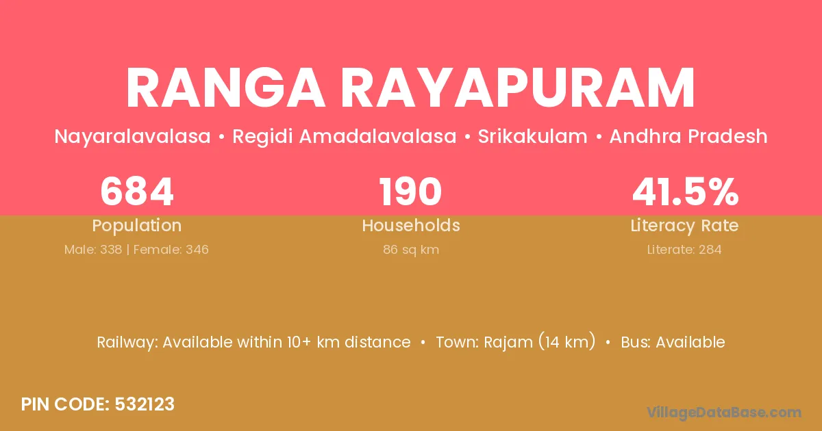 Ranga Rayapuram village has a total population of 684 people, of which 338 are males and 346 are females.
