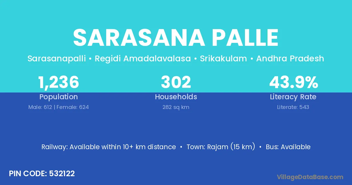 Sarasana Palle village has a total population of 1,236 people, of which 612 are males and 624 are females.