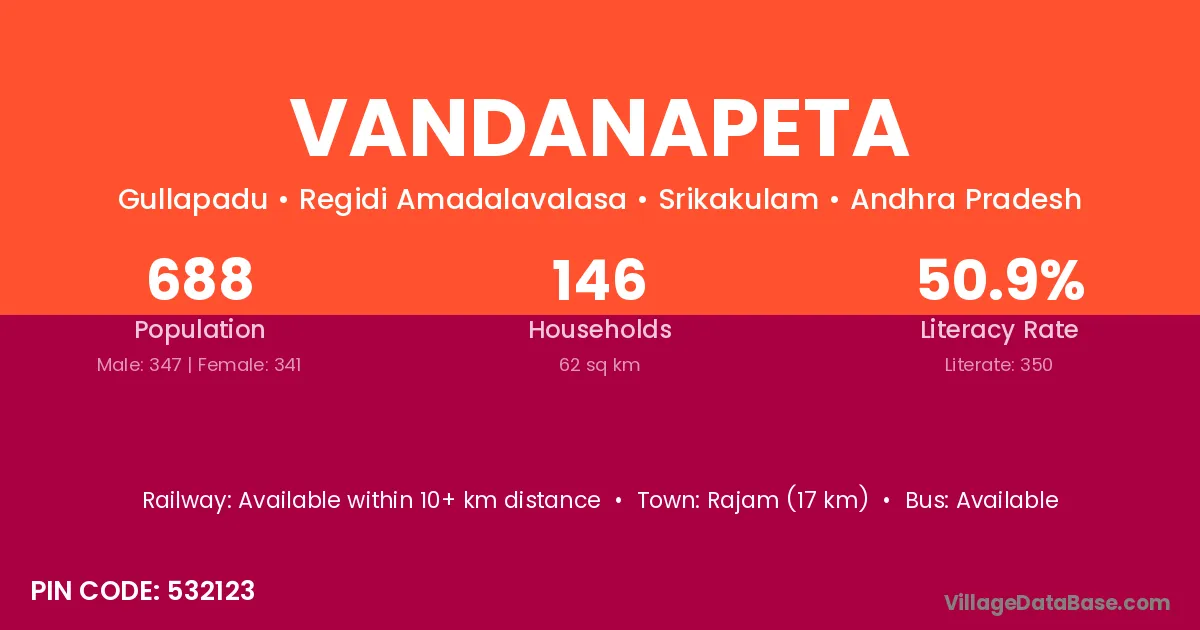 Vandanapeta village has a total population of 688 people, of which 347 are males and 341 are females.
